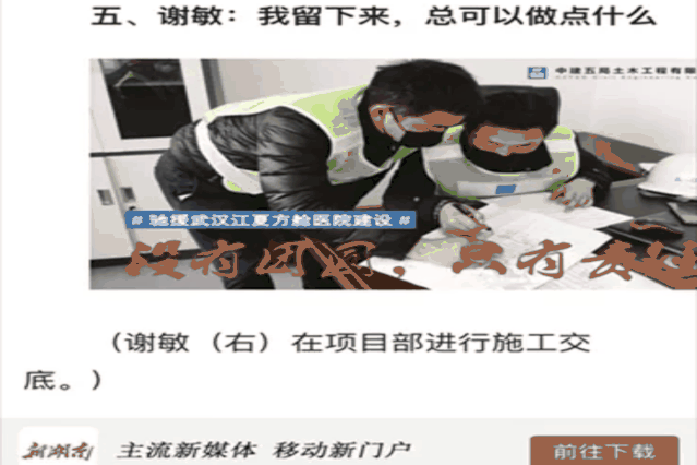 在春節(jié)前得到封城的消息,中建五局土木公司武漢江夏醫(yī)院項目經(jīng)理謝敏的老父母電話要他趕緊帶著妻子、孩子回老家,他卻婉拒了,并向公司主動請纓赴火、雷二神山參與醫(yī)院建設(shè)。“我是武漢女婿,武漢是她的家,也是我的家......”