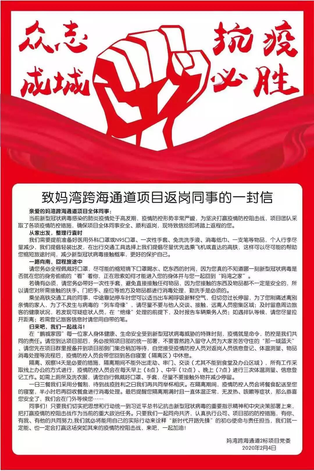 庚子新春,新型冠狀病毒牽動著億萬民眾的心,在新型冠狀病毒感染的肺炎疫情高發(fā)的嚴峻形勢下,深圳公司媽灣跨海通道項目部積極響應國家號召,不等不靠,采取“六步”戰(zhàn)疫法,全力以赴做好復工準備工作,堅決打贏疫情防控阻擊戰(zhàn),確保項目施工生產(chǎn)恢復正常。